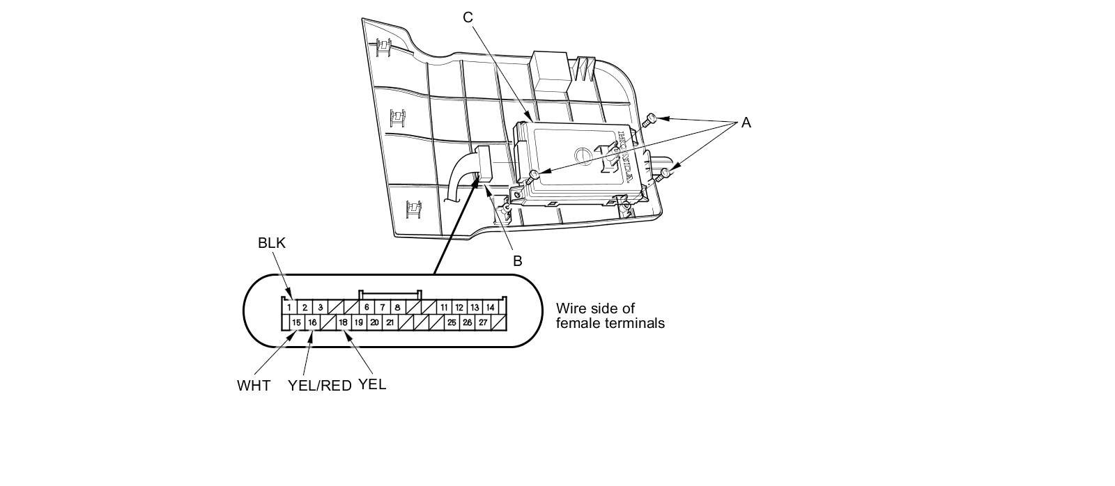 2. Remove the screws (A), then disconnect the 28P connector (B) from the HandsFreeLink control unit (C).
