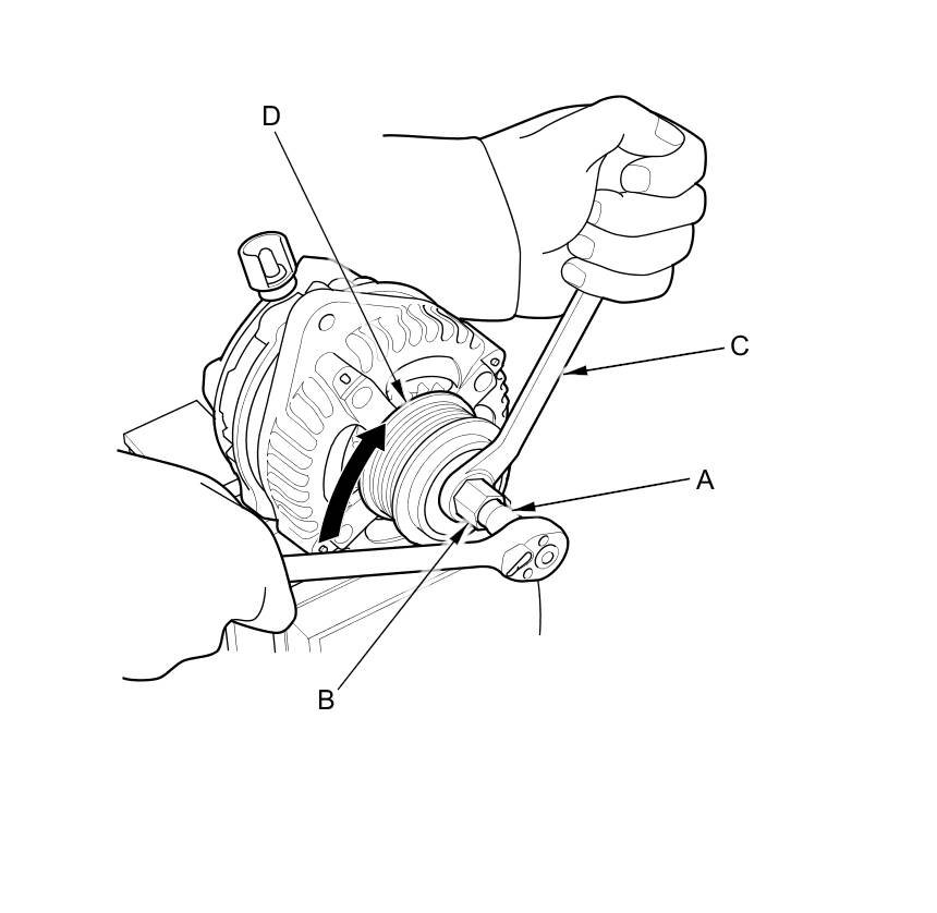 6. Hold the alternator OAD pulley holder with a 17 mm wrench (C), then turn the alternator shaft clockwise.