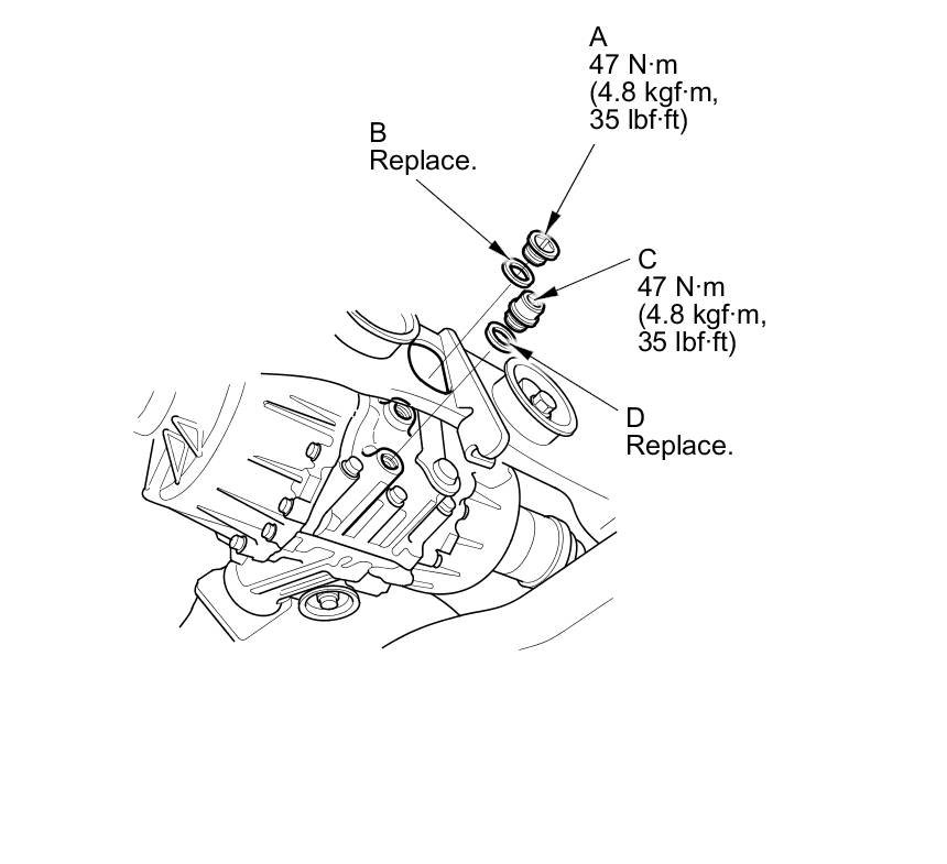 5. The fluid level must reach up the bottom of the filler plug hole. If necessary, add the recommended fluid until it runs out of the filler hole, then reinstall the filler plug with a new sealing washer.