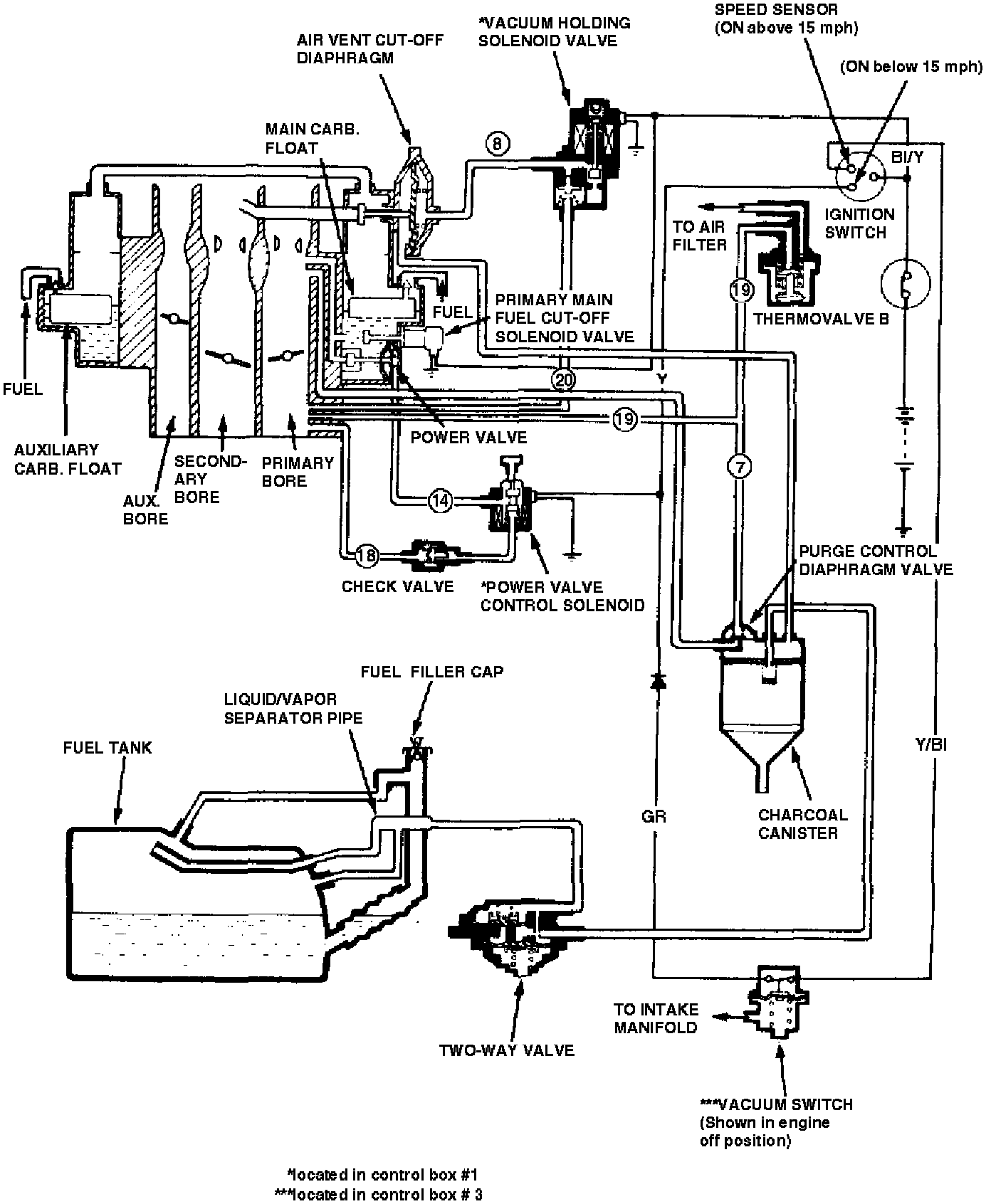 On 1980 Civic, purge control solenoid valve is controlled by a thermosensor which reacts to engine coolant temperature. This system also incorporates an air vent cut-off diaphragm which, when engine is off, cuts off air vent passages in main and auxiliary float chambers, venting fuel vapors in float chambers into canister. Manifold vacuum holds diaphragm open when engine is running. A vacuum holding valve stabilizes manifold vacuum at diaphragm. A primary main fuel cut-off solenoid valve cuts off fuel passages for main and slow primary fuel metering system when engine is off so that fuel from float chamber cannot enter carburetor bore.