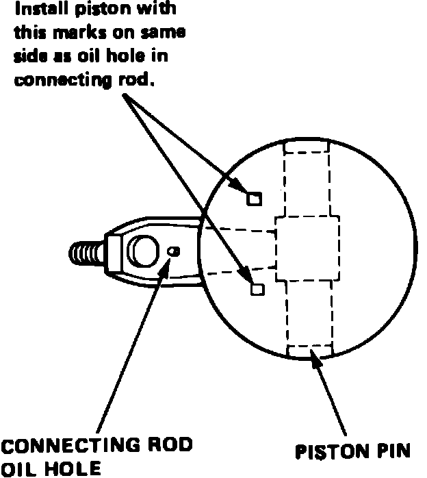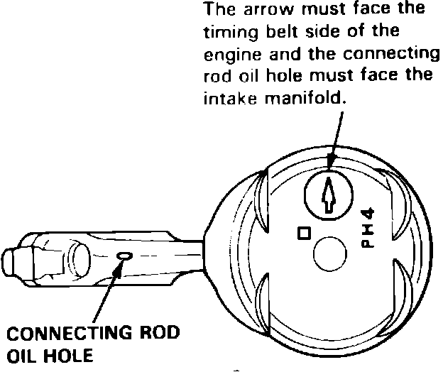 On 1984-85 Accord and 1984-87 Prelude with carbureted engine, assemble piston onto connecting rod so that mark(s) on piston head are on same side as oil hole, Figs. 28 and 29, and install piston/rod assemblies with connecting rod oil hole facing intake manifold side of engine. On 1986-87 Accord and Prelude with fuel injected engine, assemble piston onto connecting rod so that in installed position arrow on piston head will face the timing belt and connecting rod oil holes will face intake manifold side of engine, Fig. 30.