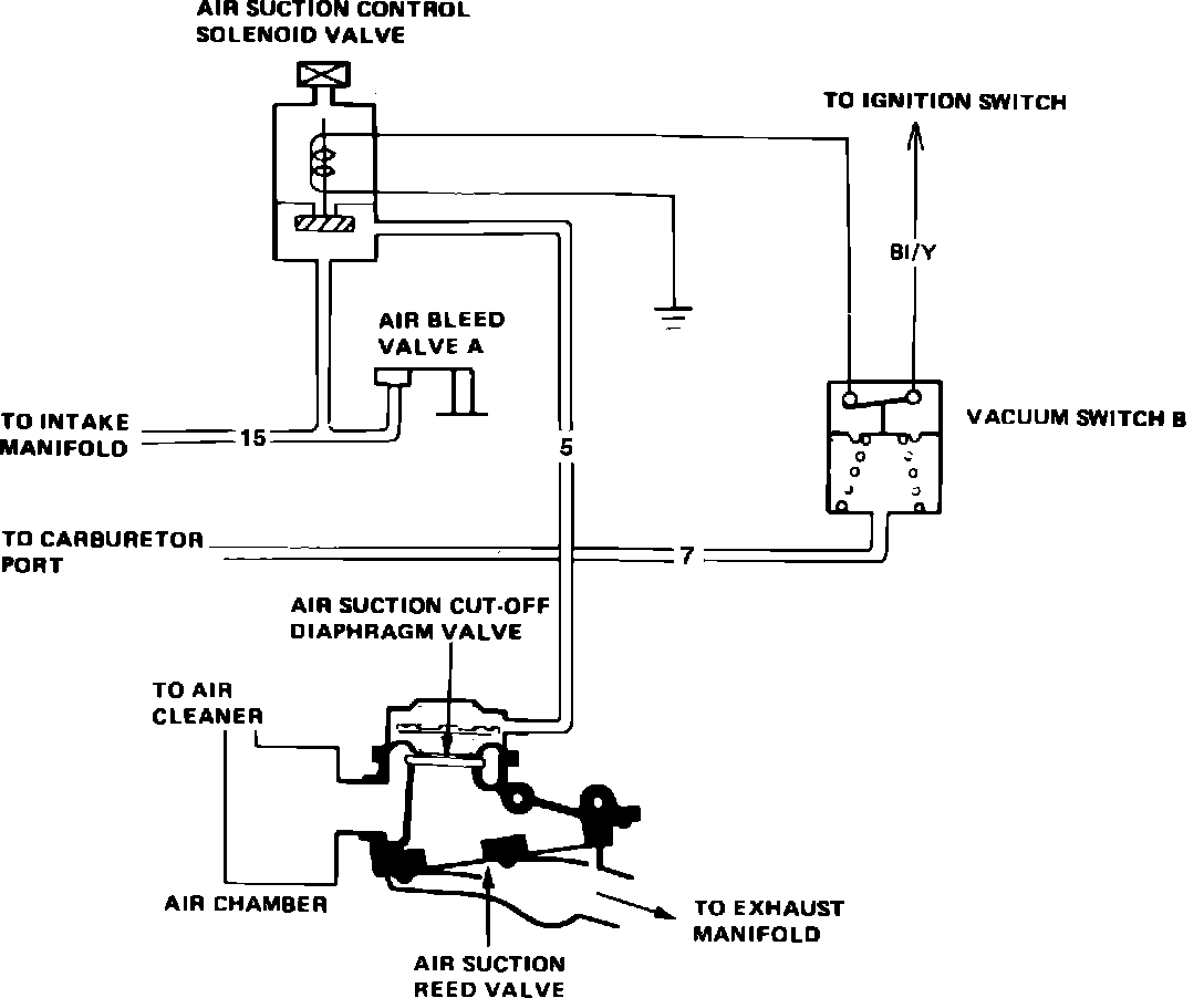 On 1984 models, when carburetor vacuum is below set value of vacuum switch and vacuum switch is turned On, the air suction control solenoid valve is open and manifold vacuum is applied to air suction diaphragm valve. Fresh air enters into the exhaust manifold makes air suction reed valve open.