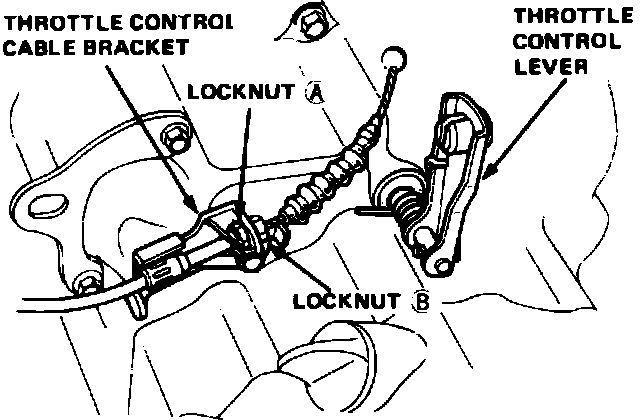 9. Remove throttle control cable end from throttle lever, loosen only locknut (B), Fig. 5, and remove cable from bracket.