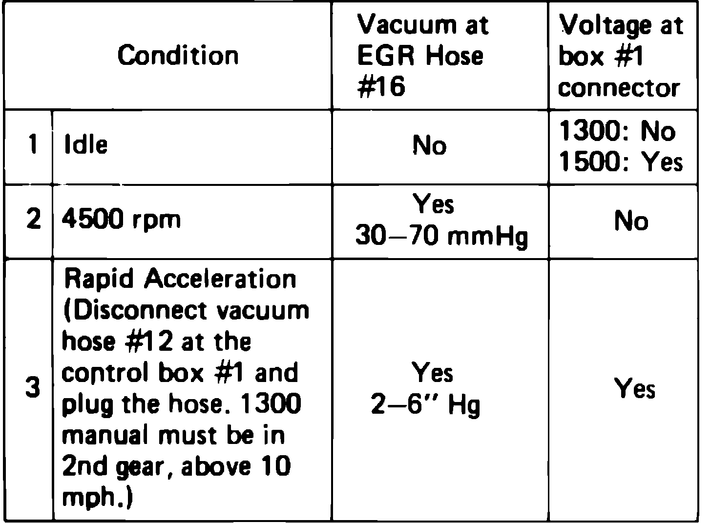 2. If voltage is not present, disconnect hose No. 15 from EGR control solenoid valve A. Check for vacuum at 4500 RPM. If vacuum is present, replace EGR solenoid valve A and repeat test. If vacuum is present, replace EGR solenoid valve A and repeat test. If vacuum is not present, check vacuum line routing and carburetor port.