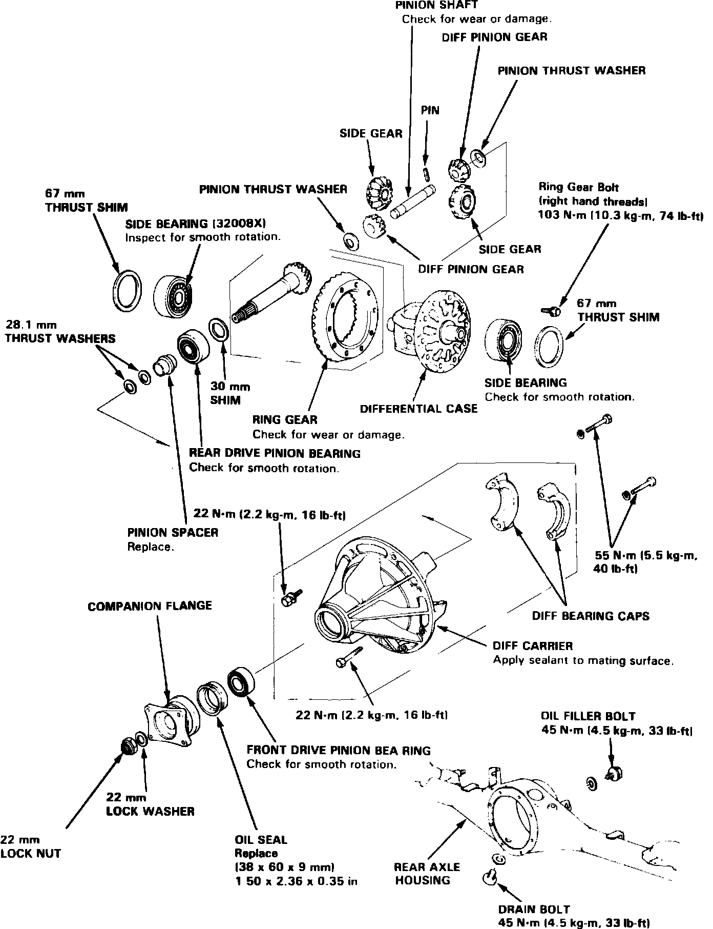 37. Check gear tooth contact and total preload. Drive pinion preload 10-13 inch lbs. plus differential case preload 3.4-5.2 inch lbs.
