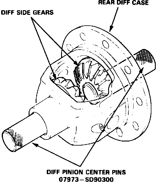 1. Install differential side gears into case by installing Differential Pinion Center Pin 07973-SD90300 or equivalent through case into side gears, Fig. 2.