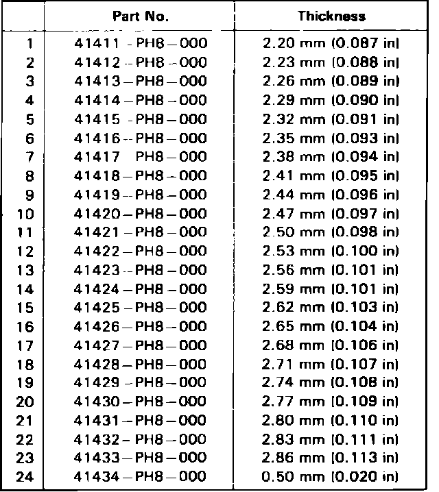 b. Example; Value obtained in step 15 is 0.85 mm, mark on pinion is plus 2, 0.85 mm - 0.02 mm = 0.83 mm shim thickness. Refer to Fig. 5 for pinion shim selection chart.