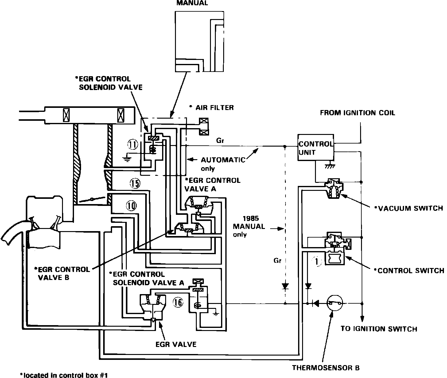 On models with carbureted engines, the EGR valve is operated by vacuum from the carburetor port and provides EGR volume proportional to engine loads by the operation of the EGR control valves A and B.