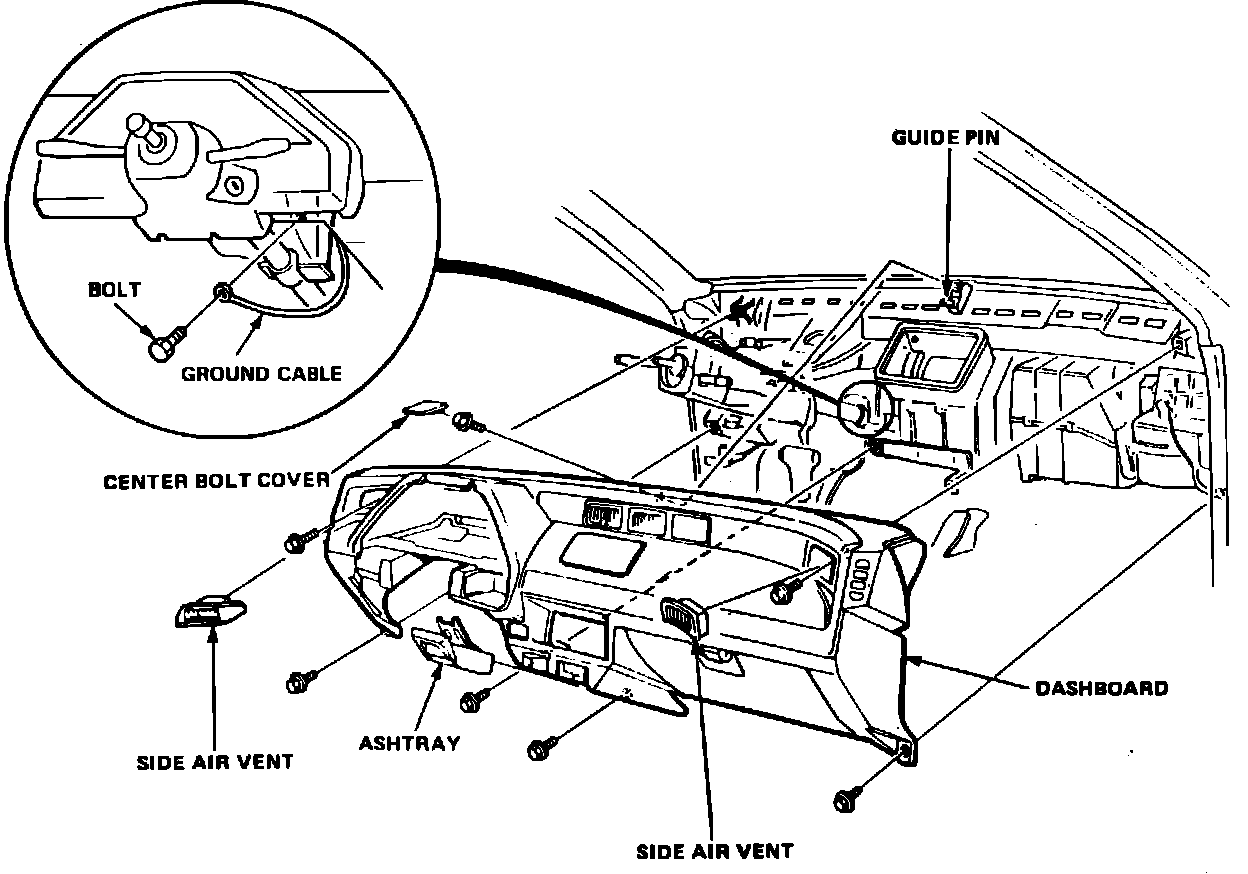 13. Reverse procedure to install. When installing instrument panel, ensure panel is properly positioned on guide and that wiring harness are properly routed. Tighten instrument panel attaching bolts alternately and evenly, ensuring instrument panel remains properly aligned. After refilling cooling system, loosen engine cooling system bleed bolt located in upper radiator hose outlet. Start engine. Tighten bleed bolt when cooling system trapped air has escaped and coolant begins to flow.