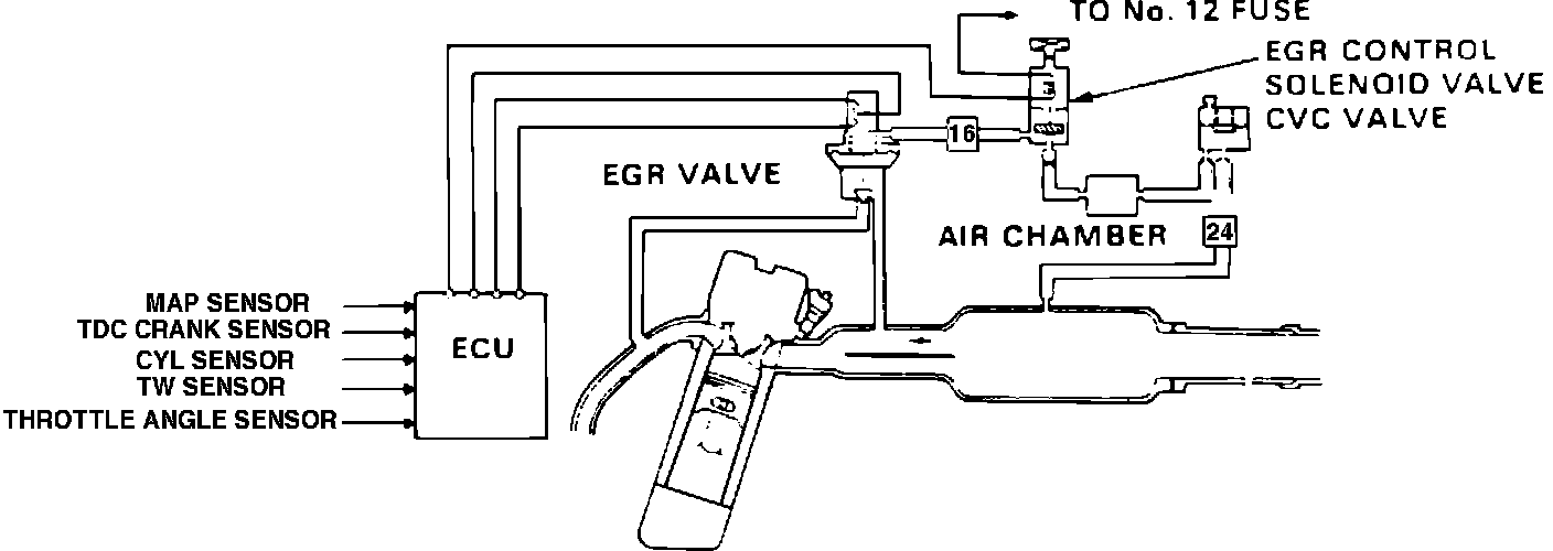 On models with fuel injected engines, the EGR valve is operated by vacuum from the intake manifold. When the EGR control solenoid valve opens, the EGR valve closes since vacuum is relieved into the intake manifold through the EGR control solenoid valve.