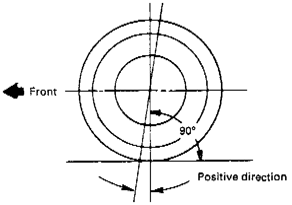 Caster is the tilting of the wheel axis either forward or backward from the vertical (when viewed from the side of the vehicle). A backward tilt is positive (+) and a forward tilt is negative (-). On the short and long arm type suspension you cannot see a caster angle without a special instrument, but if you look straight down from the top of the upper control arm to the ground, the ball joints do not line up (fore and aft) when a caster angle other than 0 degree is present. With a positive angle, the lower ball joint would be slightly ahead (toward the front of the vehicle) of the upper ball joint center line.