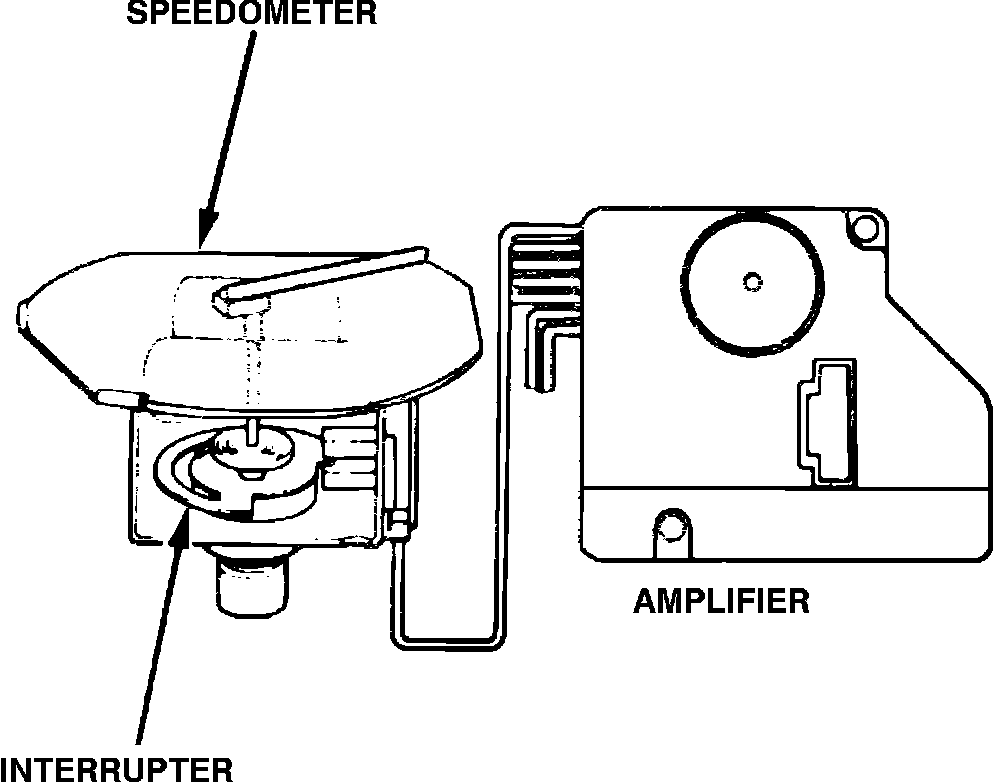 The speed sensor, Figs. 75, 76 and 77, is essentially a photo interrupter and is mounted in the speedometer. It is activated at a predetermined vehicle speed by a sealed plate rotating with the speedometer shaft.