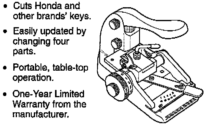 The Exacta Code Key Cutter, Manufactured by IIco Unican Co. is available from American Honda to meet your minimum key cutting requirements. For use and care, follow the manufacturer's instructions included with the Code Key Cutter Base Kit.
