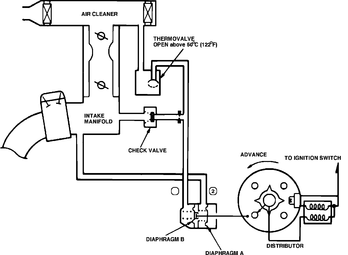 This system, Figs. 39 and 40, provides vacuum advance in response to manifold vacuum to optimize ignition timing during and after engine warm up. The distributor has two separate vacuum advance diaphragms. Diaphragm A operates on manifold vacuum. Diaphragm B also operates on manifold vacuum but has a thermovalve in the line. When engine coolant temperature is below the specified temperature of the thermovalve, the thermovalve is closed and vacuum is applied to diaphragm B to improve cold engine performance. When coolant temperature exceeds the calibration point of the thermovalve, the thermovalve opens and vacuum applied to diaphragm B is vented to atmosphere.