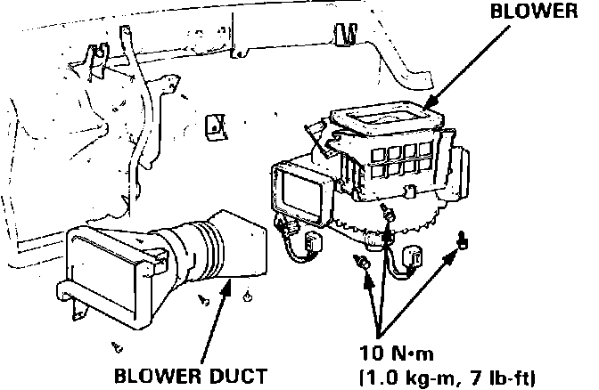 2. On vehicles equipped with heat only, remove blower duct, Fig. 1 . On vehicles equipped with A/C, remove blower assembly to evaporator housing sealing band.