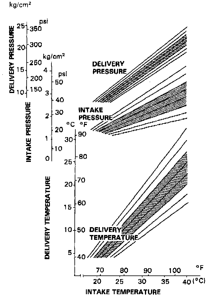 Proper intake/delivery pressure, and temperature ranges are shown on the chart.