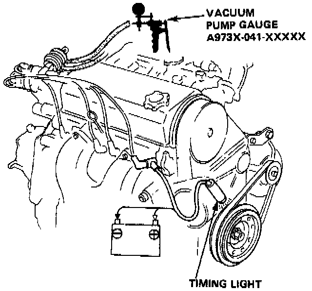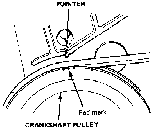 3. Reconnect vacuum hoses and connect timing light to the engine. While the engine idles, point it toward the pointer at the crankshaft pulley. If ignition timing is not within specifications, verify the integrity of the vacuum advance system before making any adjustments.