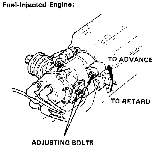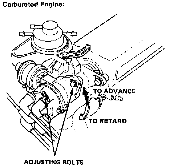 5. Loosen the distributor adjusting bolts, and turn the distributor housing counterclockwise to advance timing or clockwise to retard timing.
