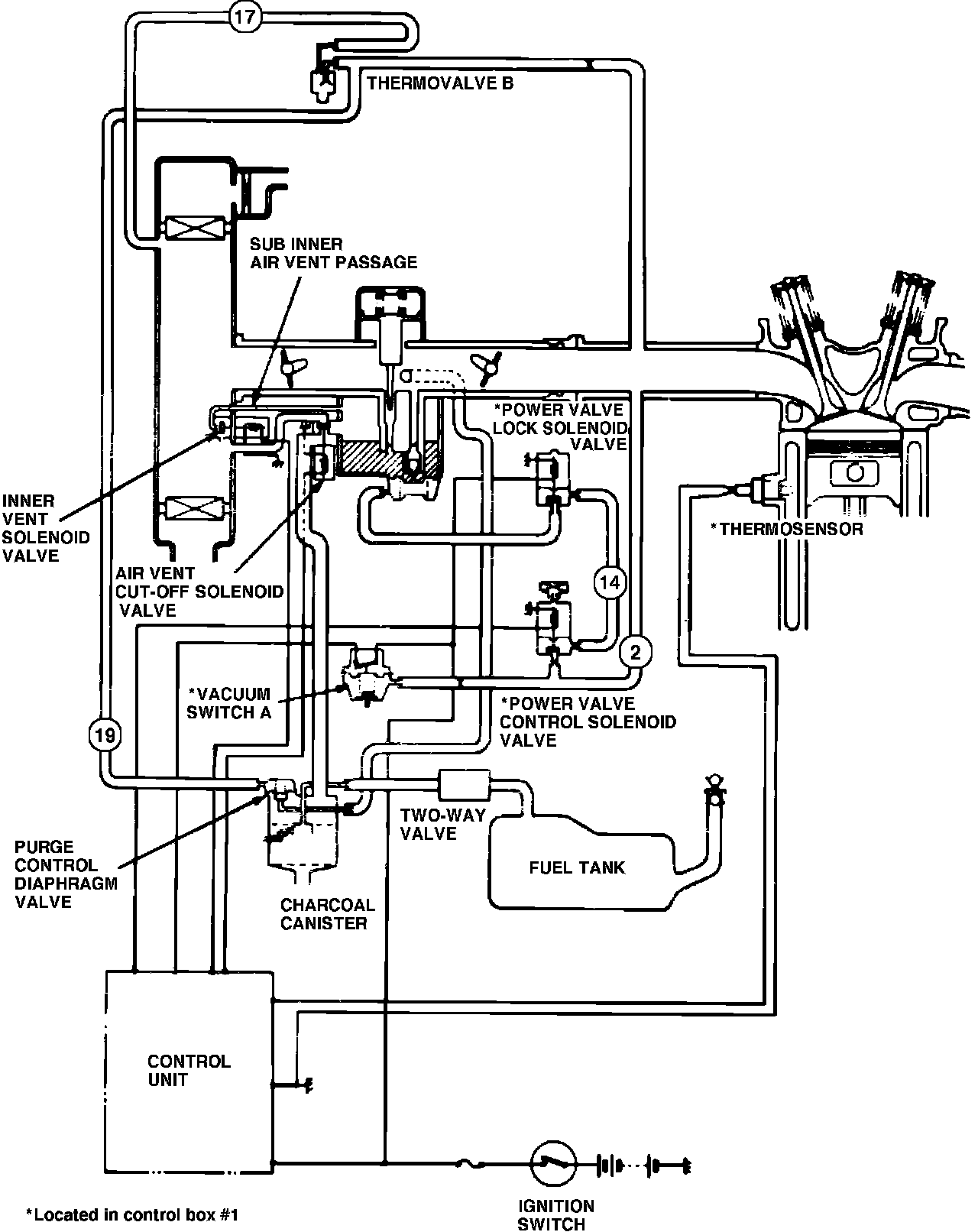 The inner vent solenoid valve also controls air flow to the carburetor float bowls. The inner vent solenoid valve normally opens the sub-inner air vent passage when engine is running, but will only allow fuel vapor to be vented to the air cleaner.