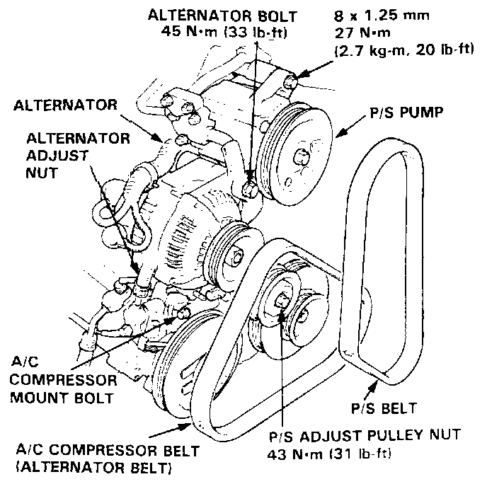 NOTE: On cars with air conditioning (A/C): Remove the A/C compressor mount bolts, then remove the A/C compressor and the belt.