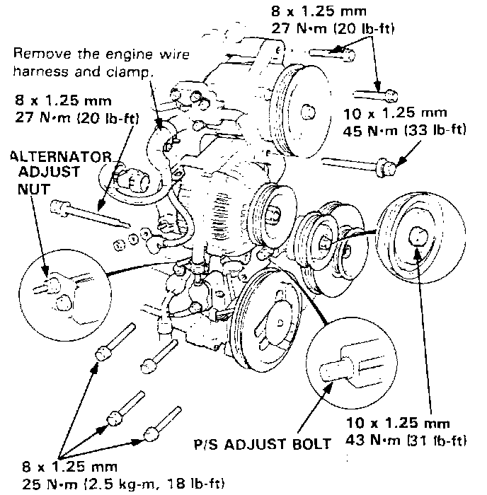 3. Remove the power steering pump adjust pulley nut and the adjust bolt, then remove the adjust pulley, P/S pump and the belt.