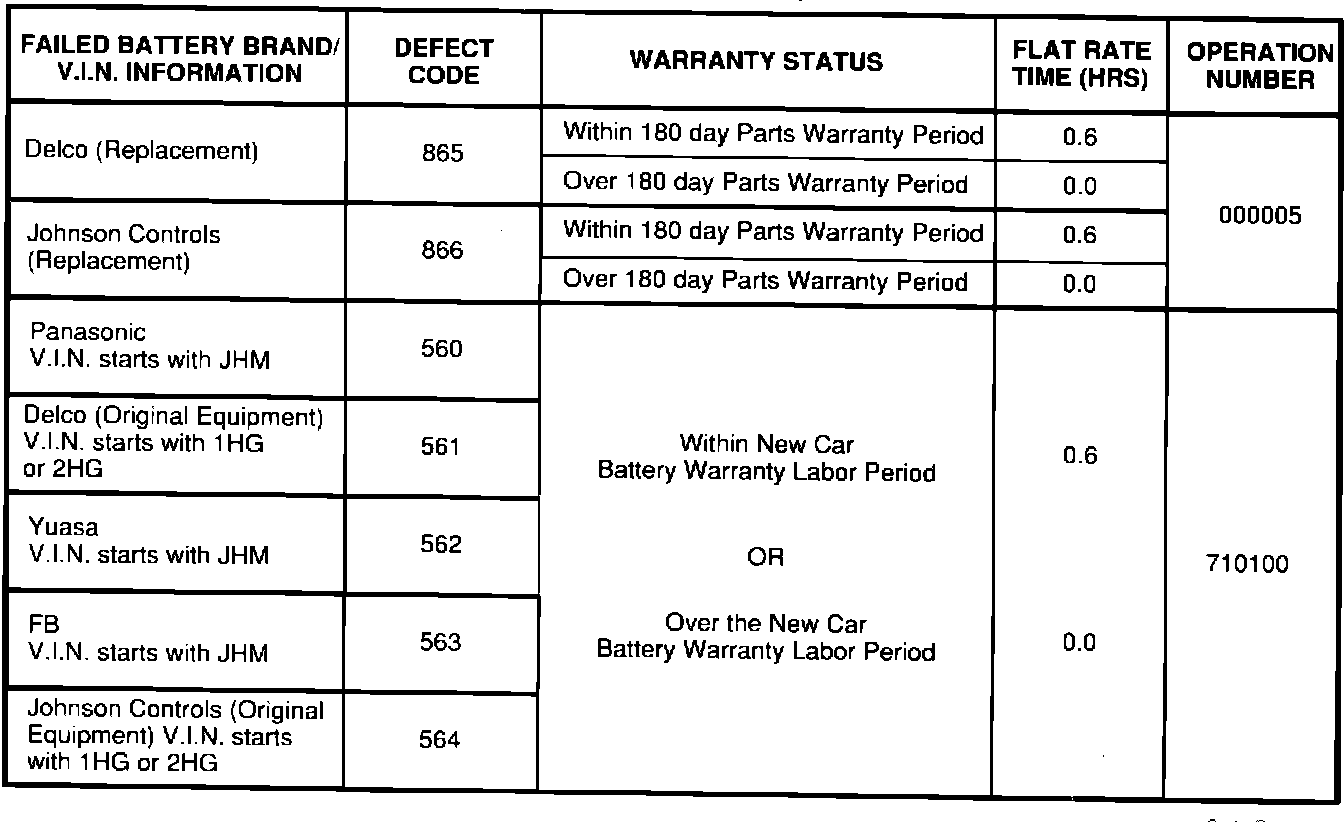 NOTE: The correct Defect Code for the FAILED BATTERY BRAND must be entered, or the claim will be rejected. DO NOT enter the Defect Code for the new replacement battery. The Warranty Claim Chart lists the ONLY Defect Codes that can be used for the battery claim.