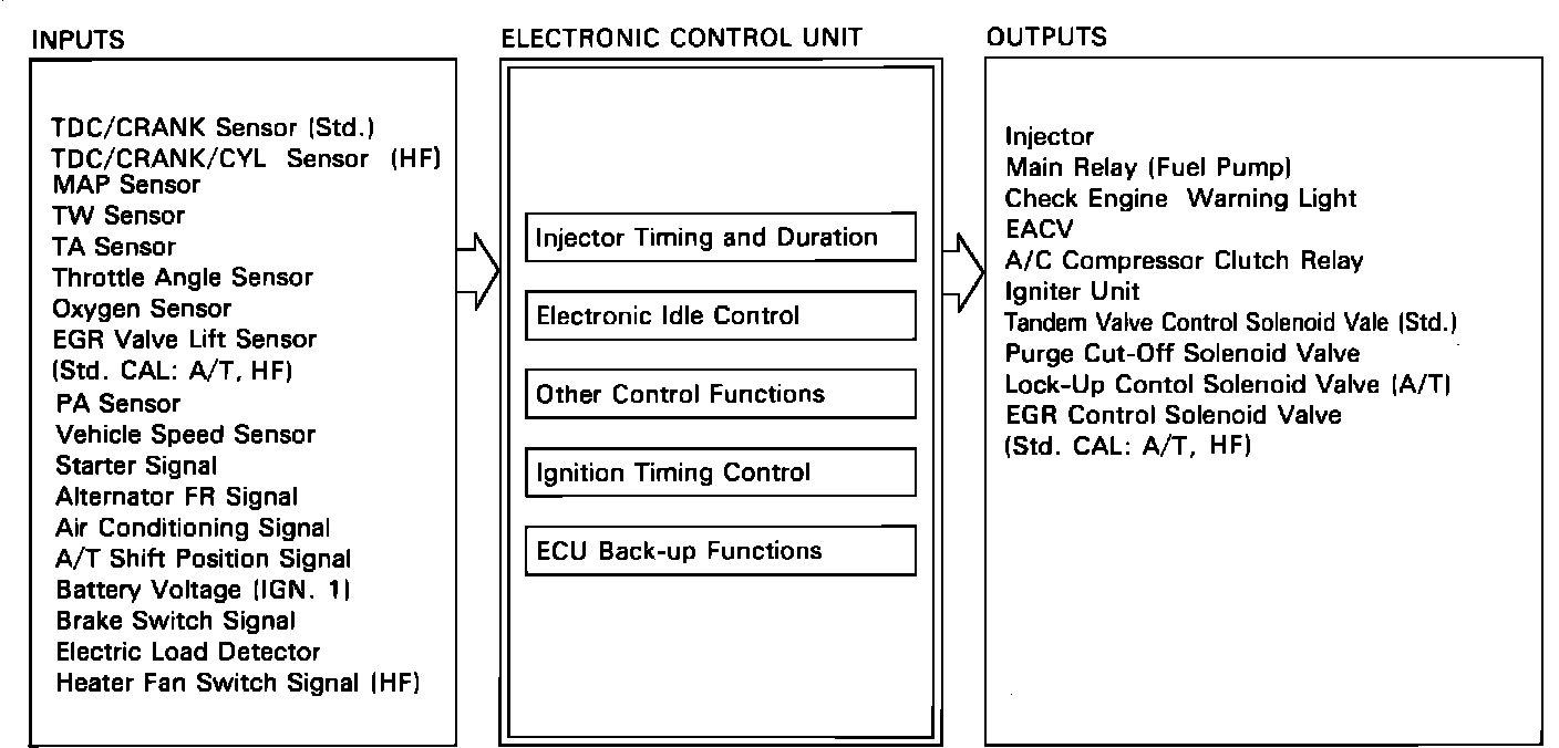 When an abnormality occurs in a signal from a sensor, the ECU lights the CHECK ENGINE warning light, stores the failure code in erasable memory, and indicates the code with the LED on the ECU anytime the ignition is on. When the ignition is initially turned on, the ECU supplies ground for the CHECK ENGINE warning light for two seconds.