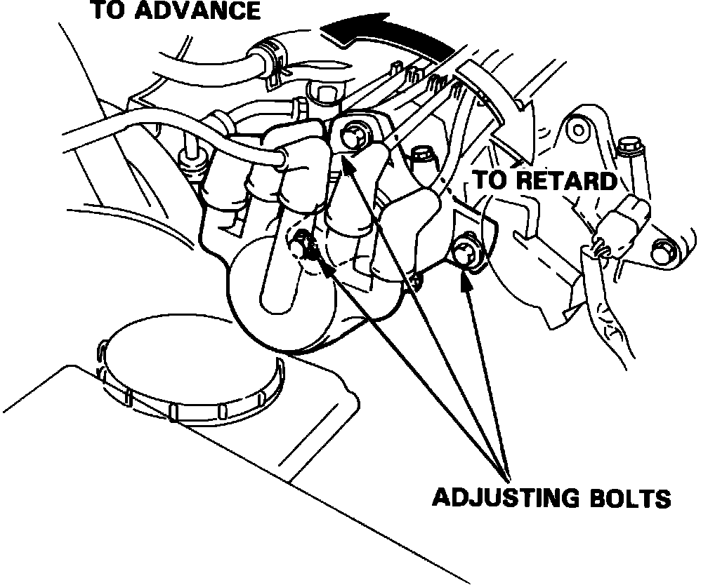 6. Adjust by loosening the distributor adjusting bolts, and turn the distributor housing counterclockwise to advance the timing, or clockwise to retard timing.