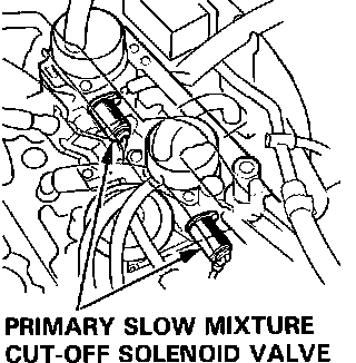 The primary slow mixture cut-off solenoid valve is mounted on each carburetor. It contains a spring loaded rod that protrudes into the fuel passage used by the idle circuit. When energized the rod is pulled out of the passage allowing normal fuel flow. It is provided to cut off the idle mixture passage when the ignition is switched off to prevent engine run-on. It is also employed to lower emissions and improve fuel economy by cutting the fuel supply during sudden deceleration.