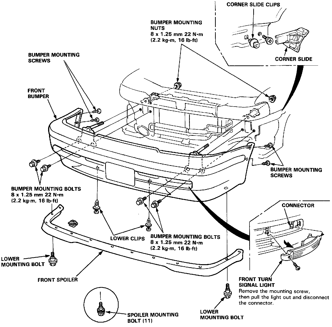 4. Remove the two lower clips, the lower mounting bolts on each side and the four bumper mounting bolts.