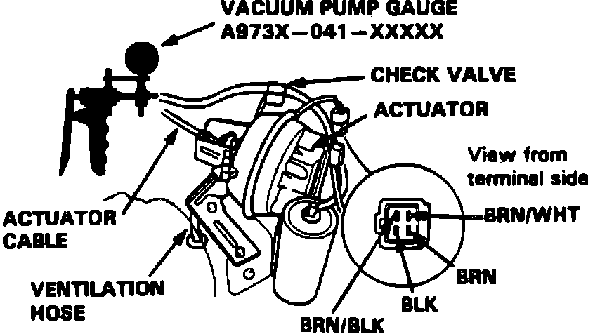7. Disconnect ground from brown/black terminal on Accord models and C terminal on Prelude models. Actuator rod should return. If actuator rod does not return and ventilator hose and filter are free, solenoid valve assembly is defective.
