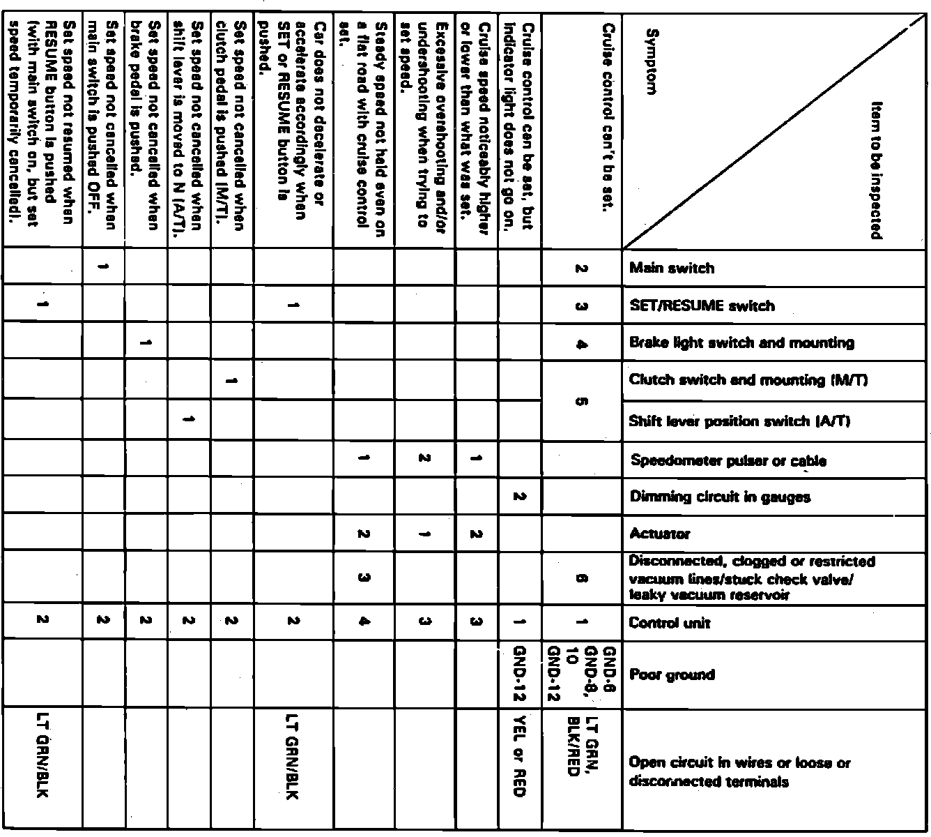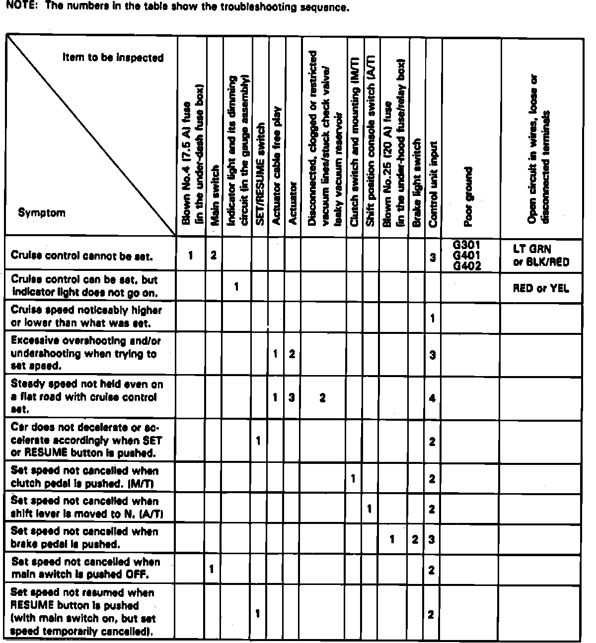 Prior to troubleshooting the speed control system, check No. 2 (10A) and No. 4 (7.5A) fuses in the fuse box and the No. 4 (20A) fuse in the relay box, on 1989 models and fuses No. 1 (10A) and No. 4 (7.5A) fuses in the fuse box and the No. 25 (20A) fuse in the relay box, on 1990-92 models. If fuses are operating, ensure horn sounds and tachometer functions properly. Refer to Figs. 3 and 4 for troubleshooting sequence.