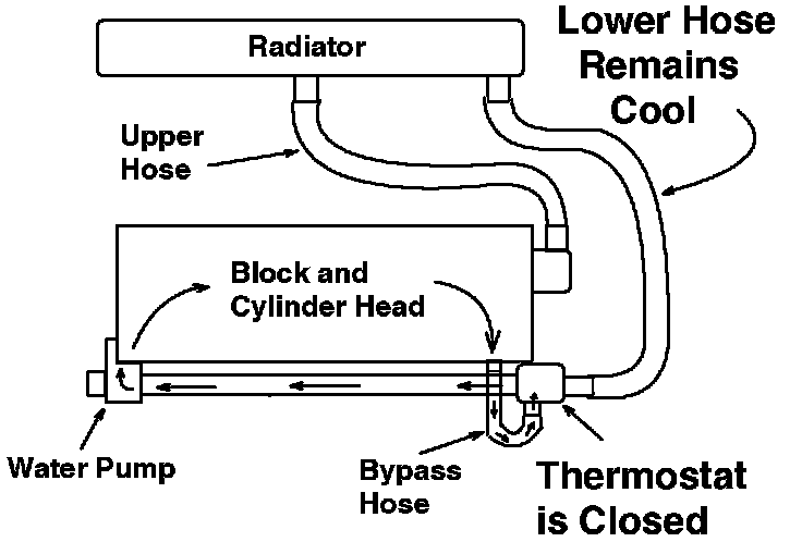 Thermostat Closed, Cold Engine - With the thermostat closed, coolant flow through the radiator is blocked forcing the coolant to re-circulate through the block and head. This allows for a rapid warm up. During this time there should be little or no coolant flow through the upper radiator hose.