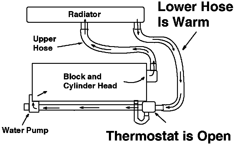Thermostat Open, Warm Engine - Once the coolant has reached normal operating temperature, the thermostat begins to open, allowing coolant flow through the upper hose and into the radiator. The thermostat will continue to regulate the amount of coolant flow to the radiator to maintain a optimum operating temperature.