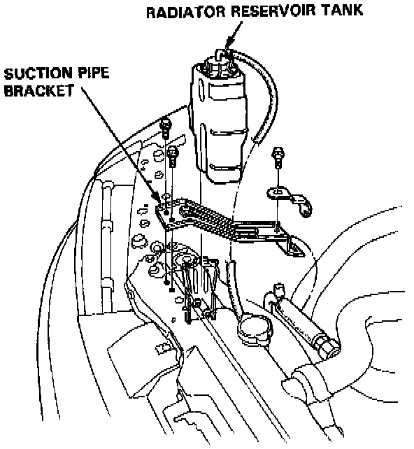 1. Use a Refrigerant Recovery/Recycling System to recover the refrigerant from the system.2. Temporarily remove the radiator reservoir tank and intake tube, then remove the suction pipe bracket.