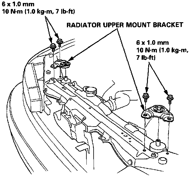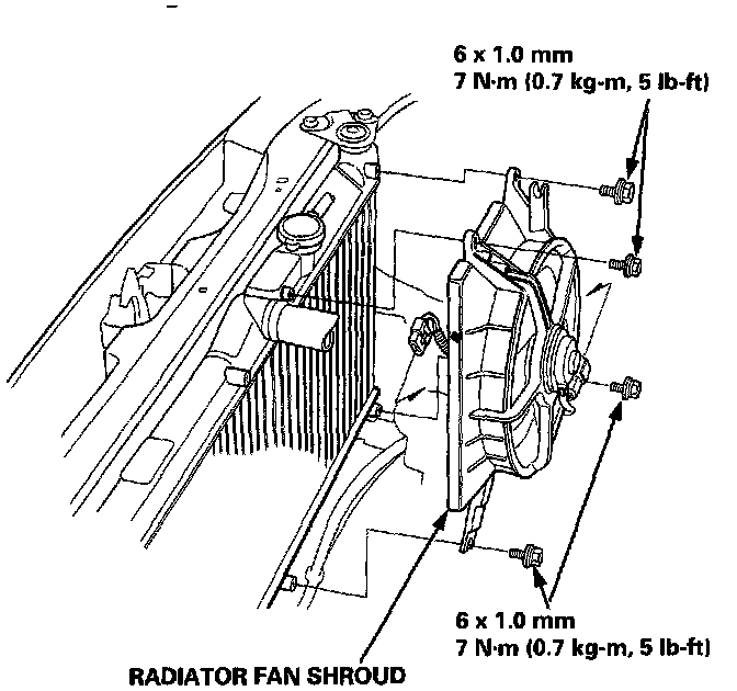 4. Disconnect the connector from the radiator fan. Remove the four mounting bolts and remove the radiator fan shroud.