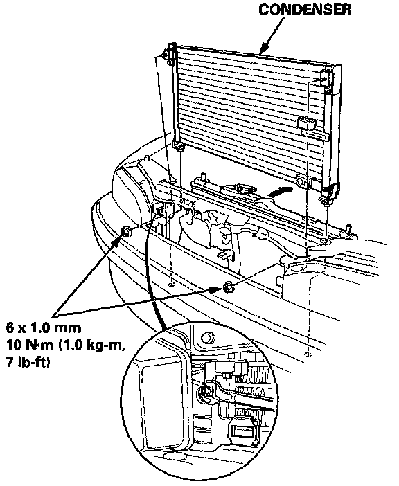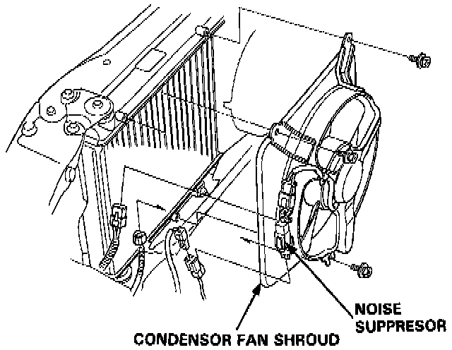 5. Disconnect the connectors from the condenser fan motor and noise suppressor, and remove the connector from the compressor. Remove the three mounting bolts and remove the condenser fan shroud.