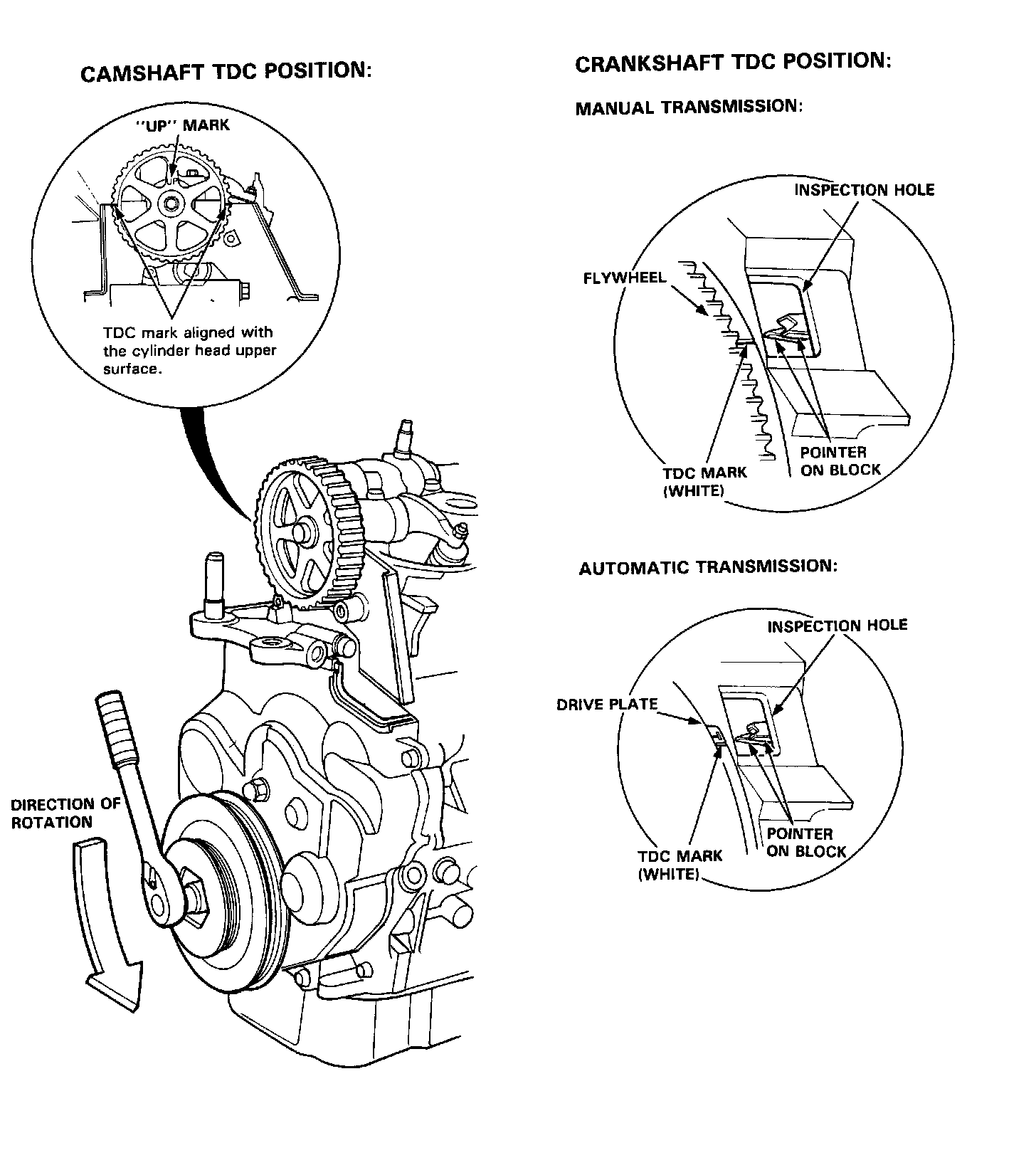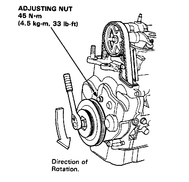 5. Rotate the crankshaft counterclockwise 3-teeth on the camshaft pulley, then reloosen the adjusting nut to create tension on the timing belt.