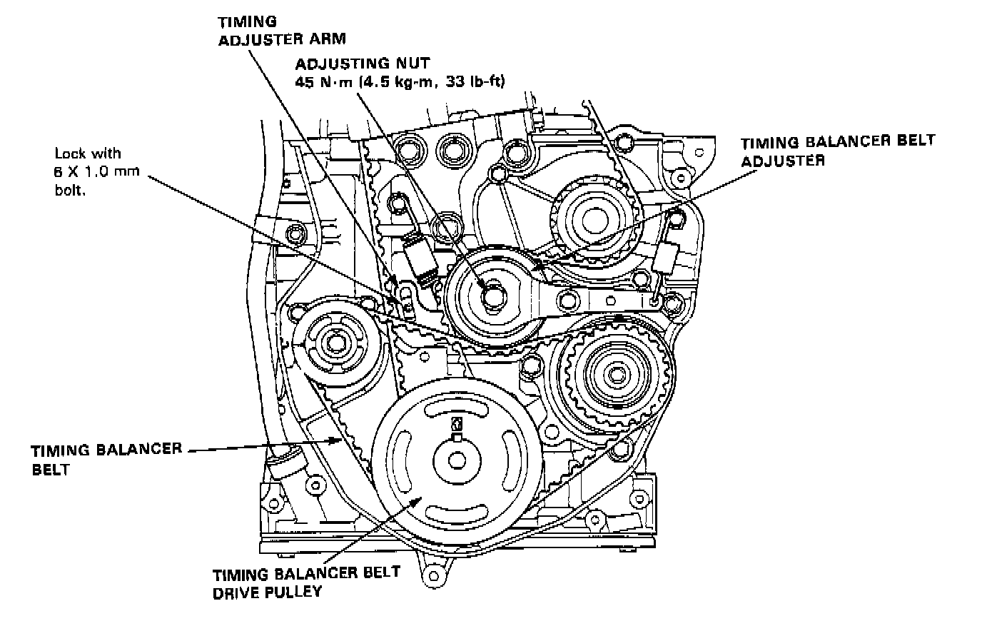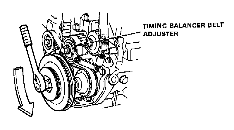14. Push the timing balancer belt tensioner and the timing belt tensioner to remove tension on the belts, then tighten the adjusting nut.