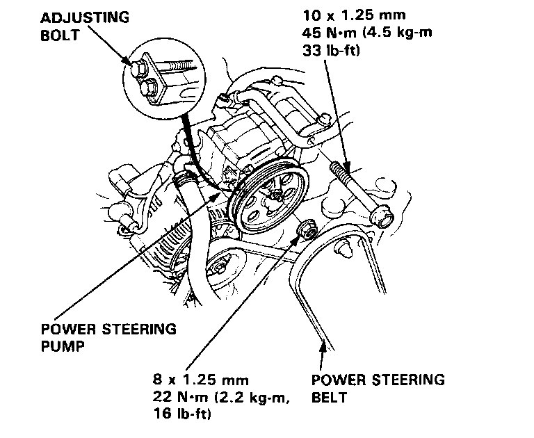 3. Remove the mounting bolt, nut and V-belt from the power steering pump, then remove the bolts and nuts. Loosen the adjusting bolt. Pull the pump away from the mounting bracket.