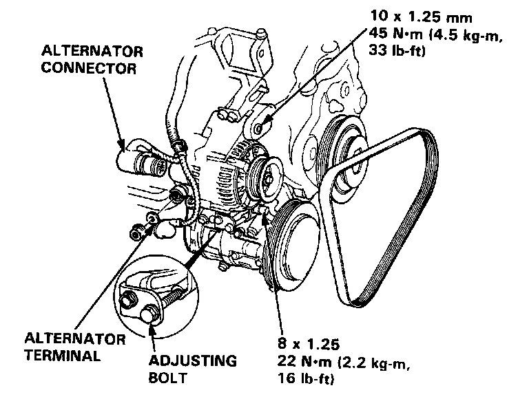 5. Loosen the alternator mounting bolt, nut and the adjusting bolt, then remove the alternator belt or air conditioning belt (cars equipped with air conditioning).