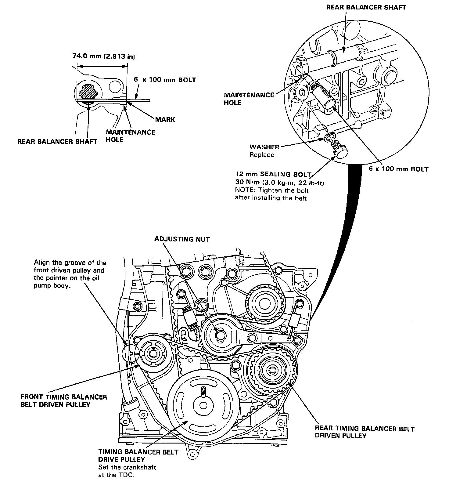 4. Align the rear timing balancer belt driven pulley using a 6 x 100 mm bolt or an equivalent, mark a line at 74 mm. Align the rear timing balancer belt driven pulley by inserting the bolt through the maintenance hole.