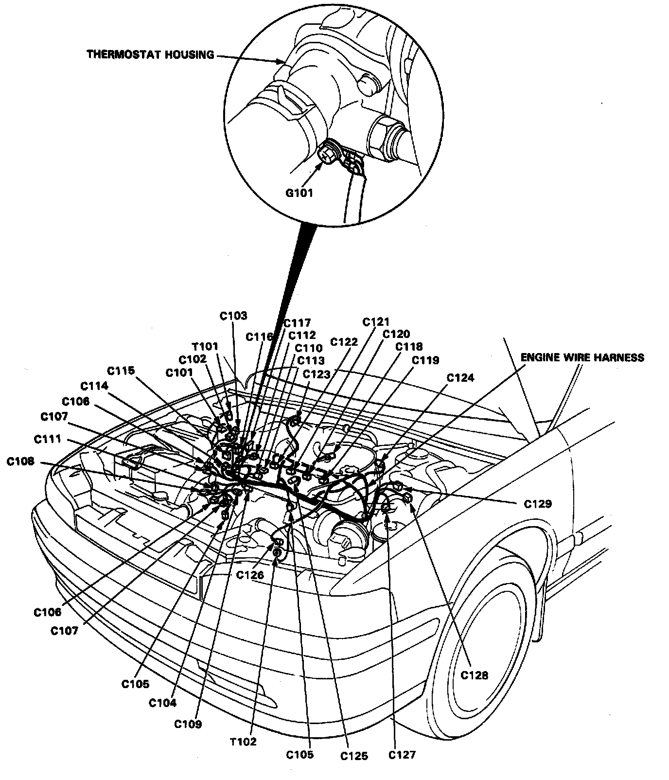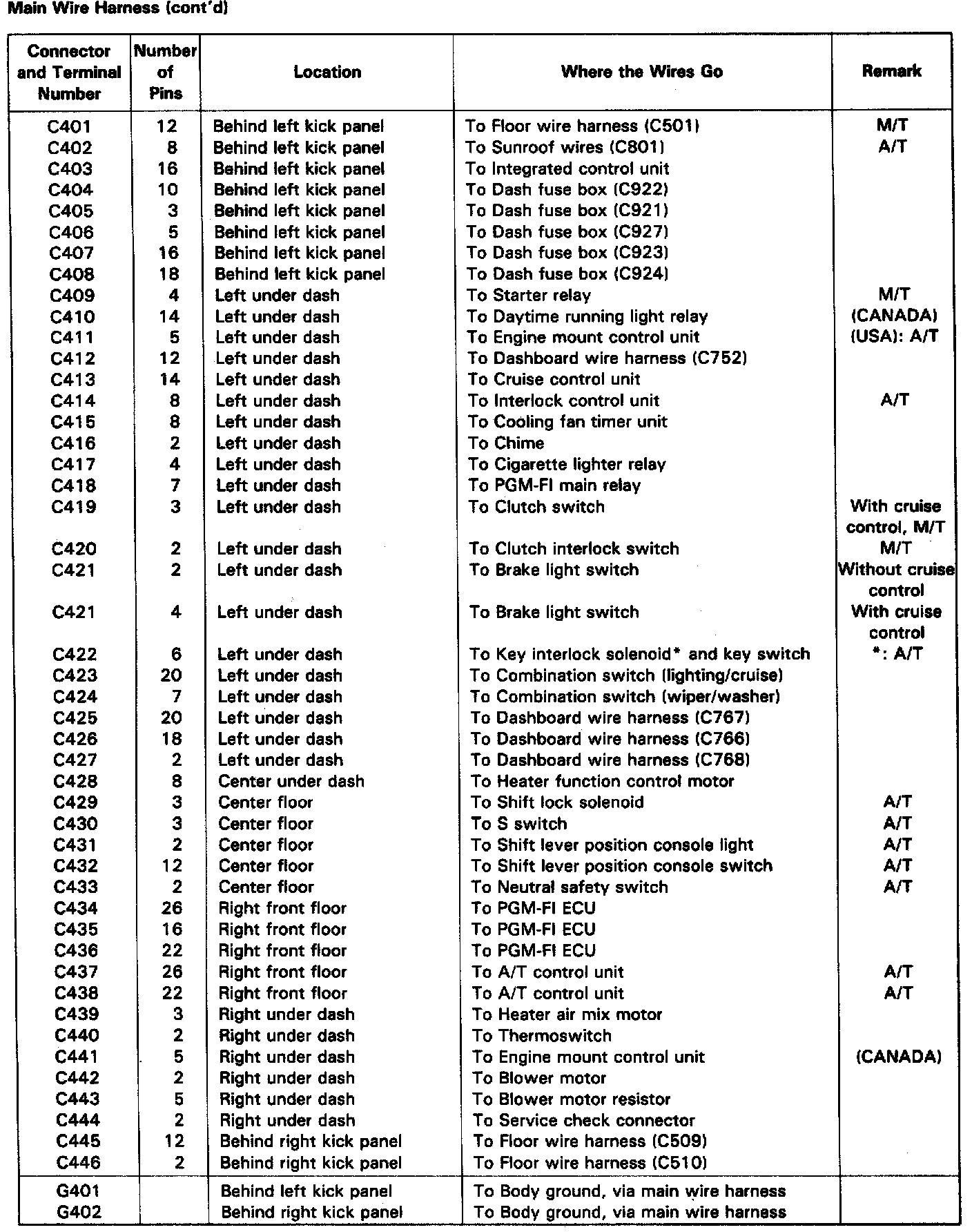 Identifying numbers have been assigned to all connectors. The number is preceded by the letter "C" for connectors, "G" for ground terminals or "T" for non ground terminals.