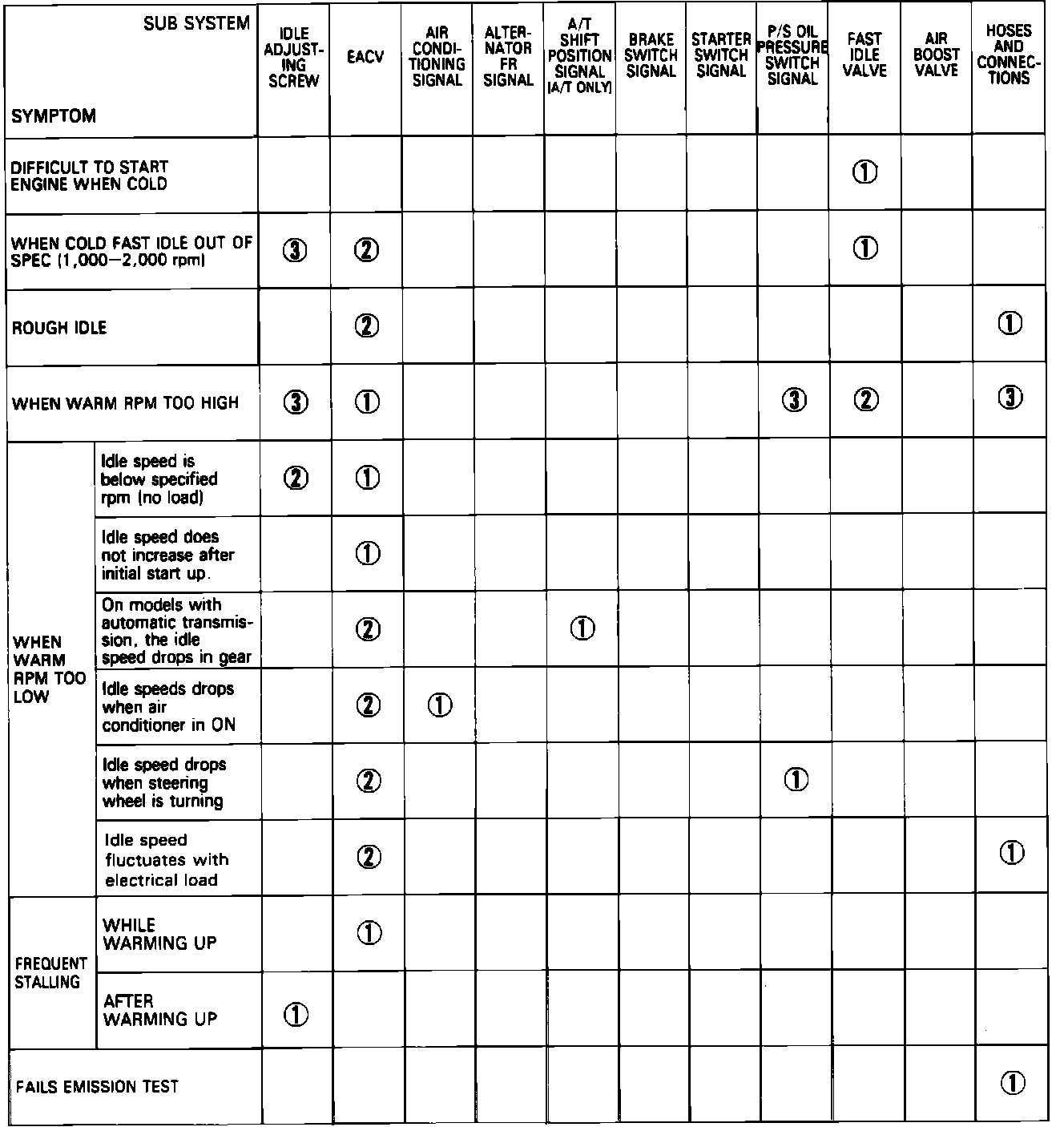 Across each row in the chart, the sub systems that could be sources of a symptom are ranked in the order they should be inspected, starting with (1). Find the symptom in the left column, read across to the most likely source, then refer to the component or system listed at the top of that column. If inspection shows that system is OK, try the next system (2), etc.