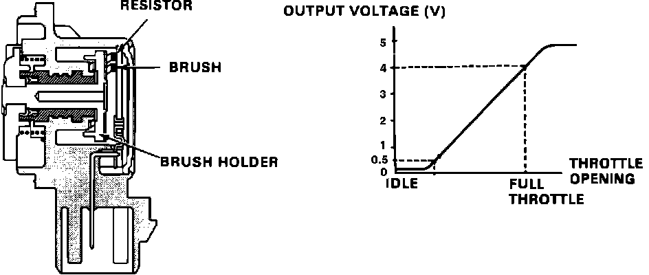 The Throttle Angle Sensor, connected to the side of the throttle body, is a linear potentiometer. It is connected to the throttle shaft. As the throttle angle changes, the throttle angle sensor varies the voltage signal to the ECU. The ECU uses this voltage signal along with the MAP Sensor voltage signal to determine engine load. The typical output voltage at idle is approx. 0-0.5 volts and at wide open throttle approx. 4.5 volts.