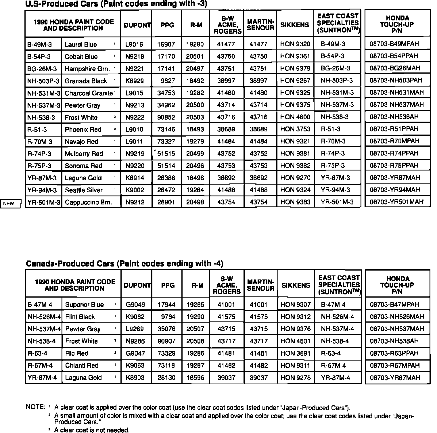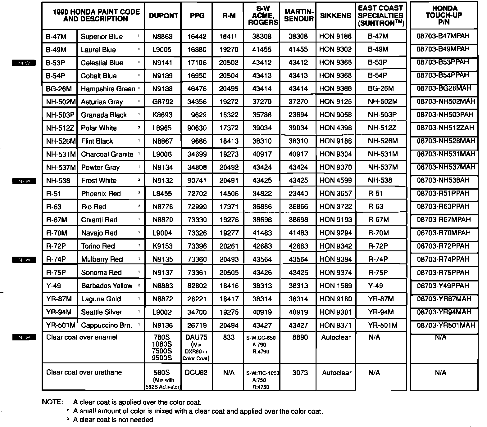 1990 Paint Codes