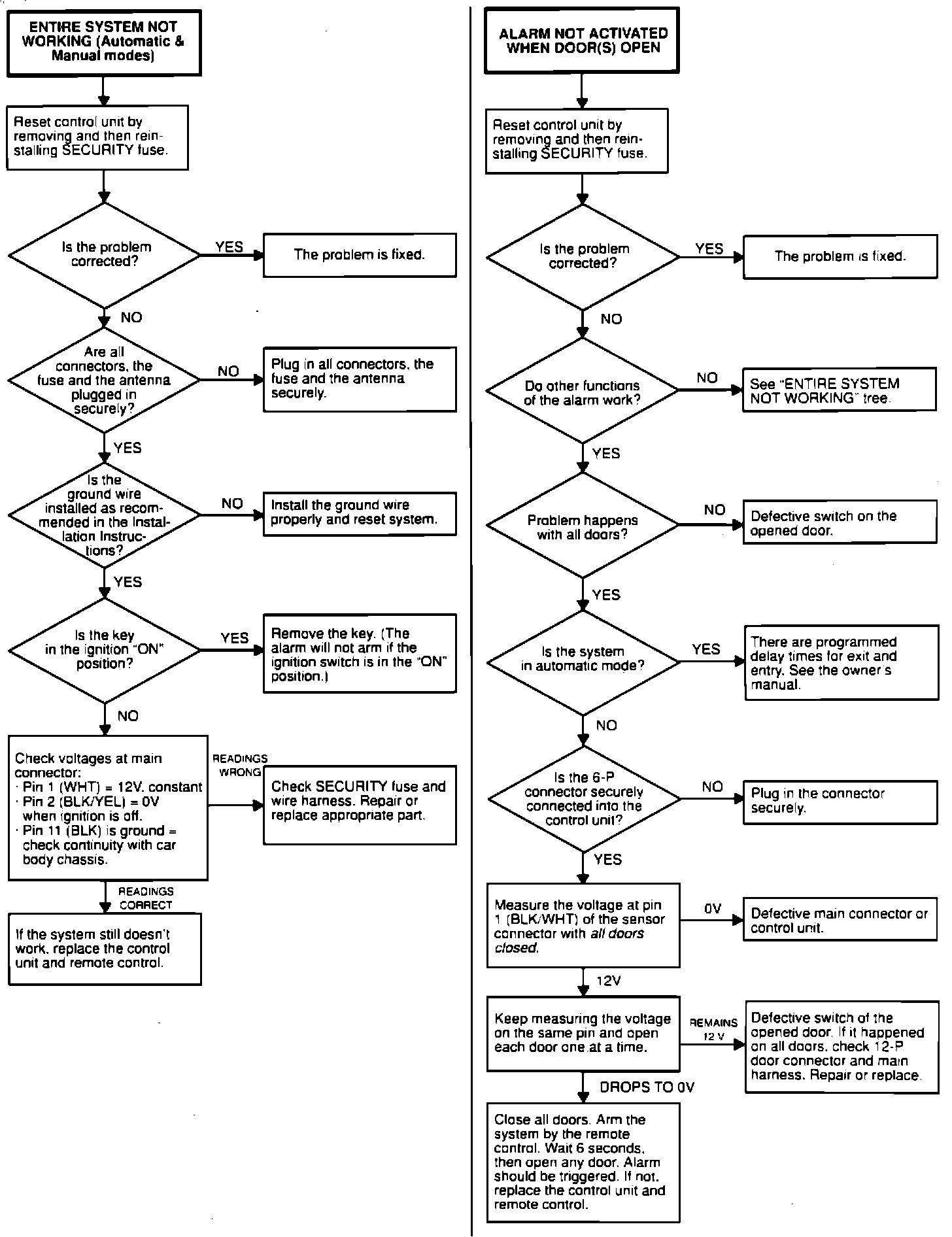 Entire System Not Working (Auto and Manual Modes) or Alarm Not Activated When Door(s) Open.