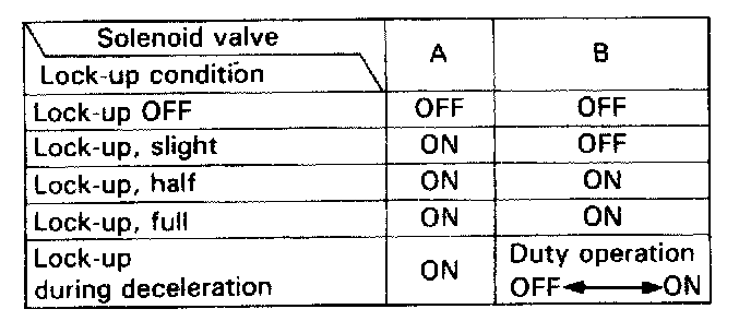 From sensor input signals, the automatic control unit detects whether to turn the lock-up ON or OFF and activates lockup control solenoid valve A and/or B accordingly.