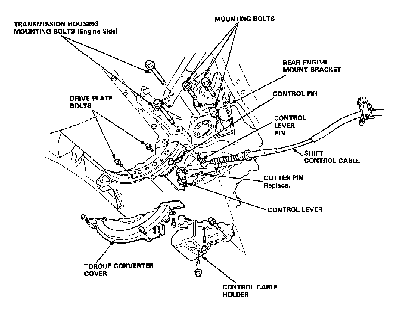 24. Remove the remaining transmission housing bolts and three mount bracket nuts.