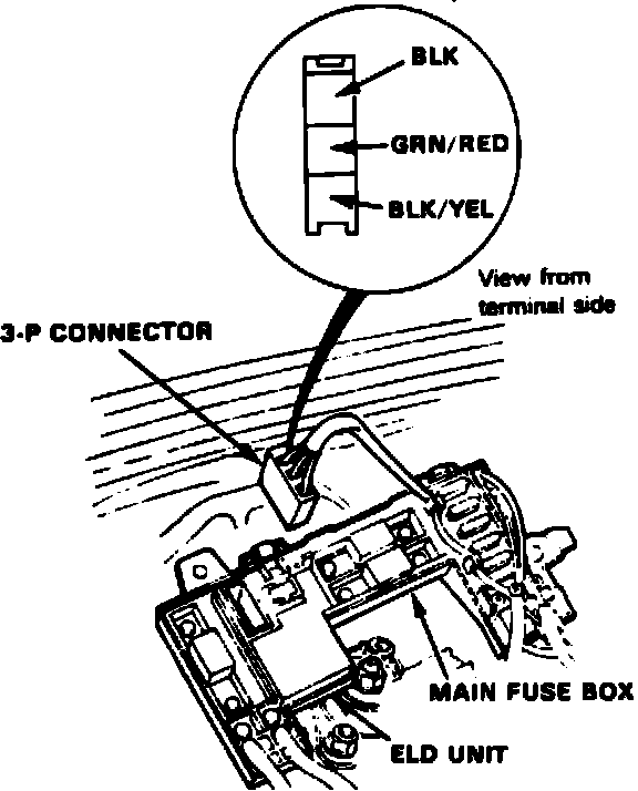 6. With ignition switch in On position and headlamps on at low beam, check voltage at green/red wire terminal at electric load detector unit electrical connector. Check voltage with connector still installed on unit. Voltage should be approximately 2 volts. If voltage is as specified, electric load detector unit is satisfactory. If voltage is not as specified, engine compartment main fuse panel and electric load detector unit must be replaced as an assembly.